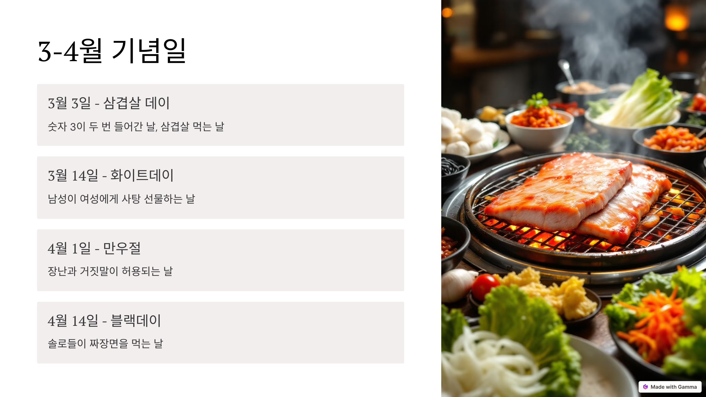 3월 3일 - 삼겹살 데이 🥩 (숫자 3이 두 번 들어간 날로, 삼겹살을 먹는 날)